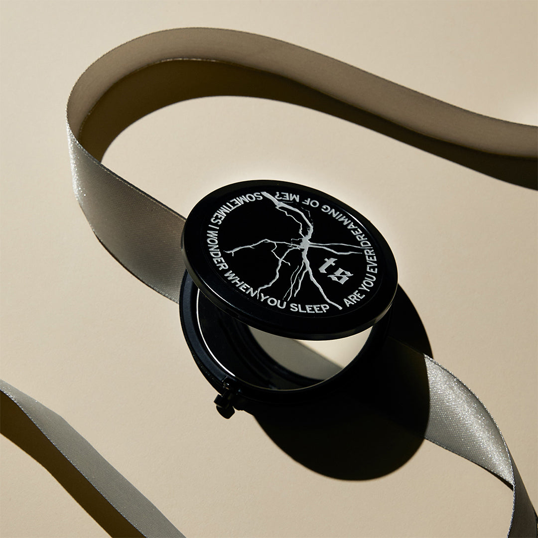 Black compact mirror featuring Sometimes I wonder when you sleep. are you ever dreaming of me? song lyrics and TS with cracked silver design etched on top.