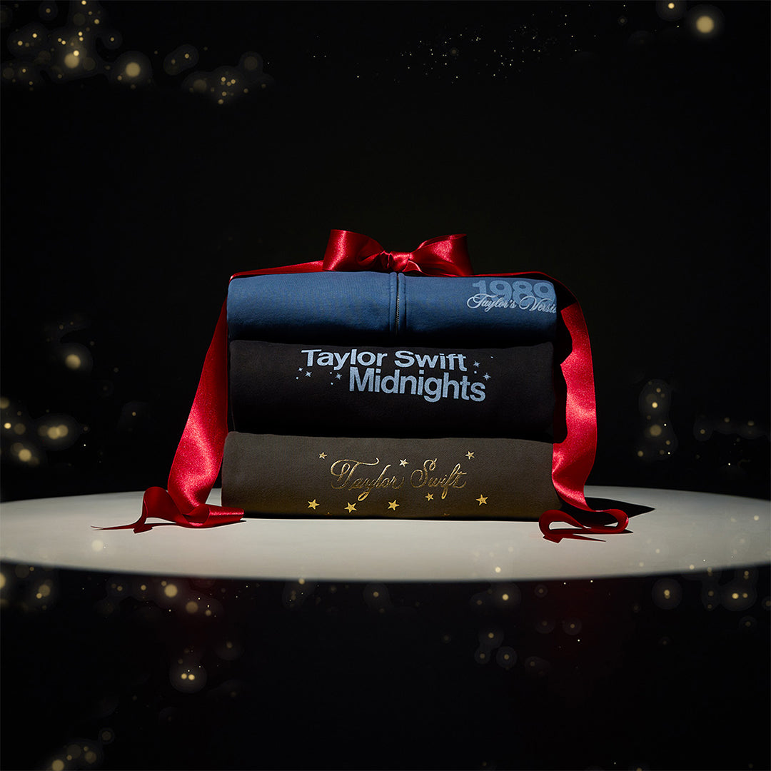 Tarmac hoodie with front pocket featuring Taylor Swift with gold star foil print design on front and photo of Taylor Swift with and I don’t know why but with you I’d dance in a storm in my best dress Fearless (Taylor’s Version) song lyrics with gold star foil print design printed on back.