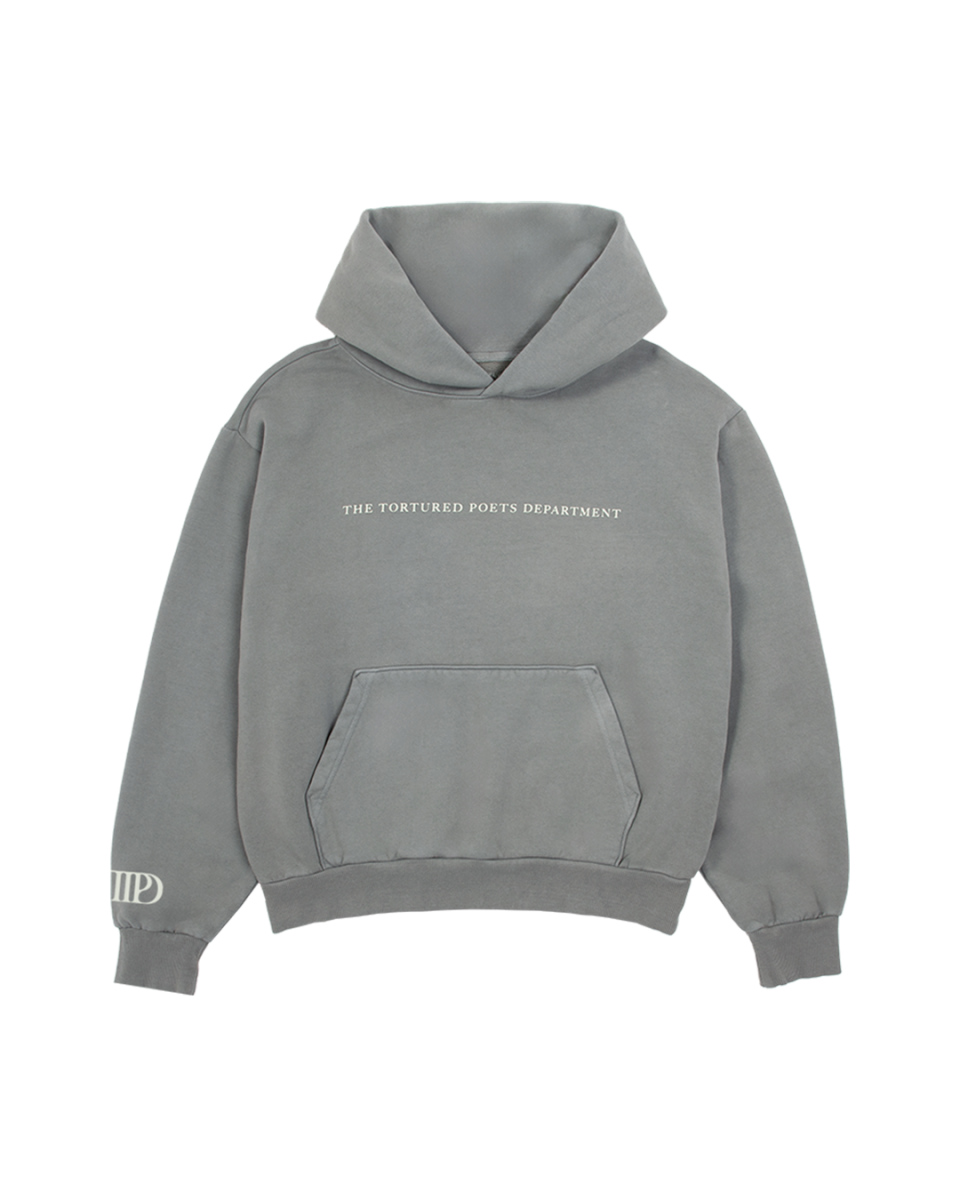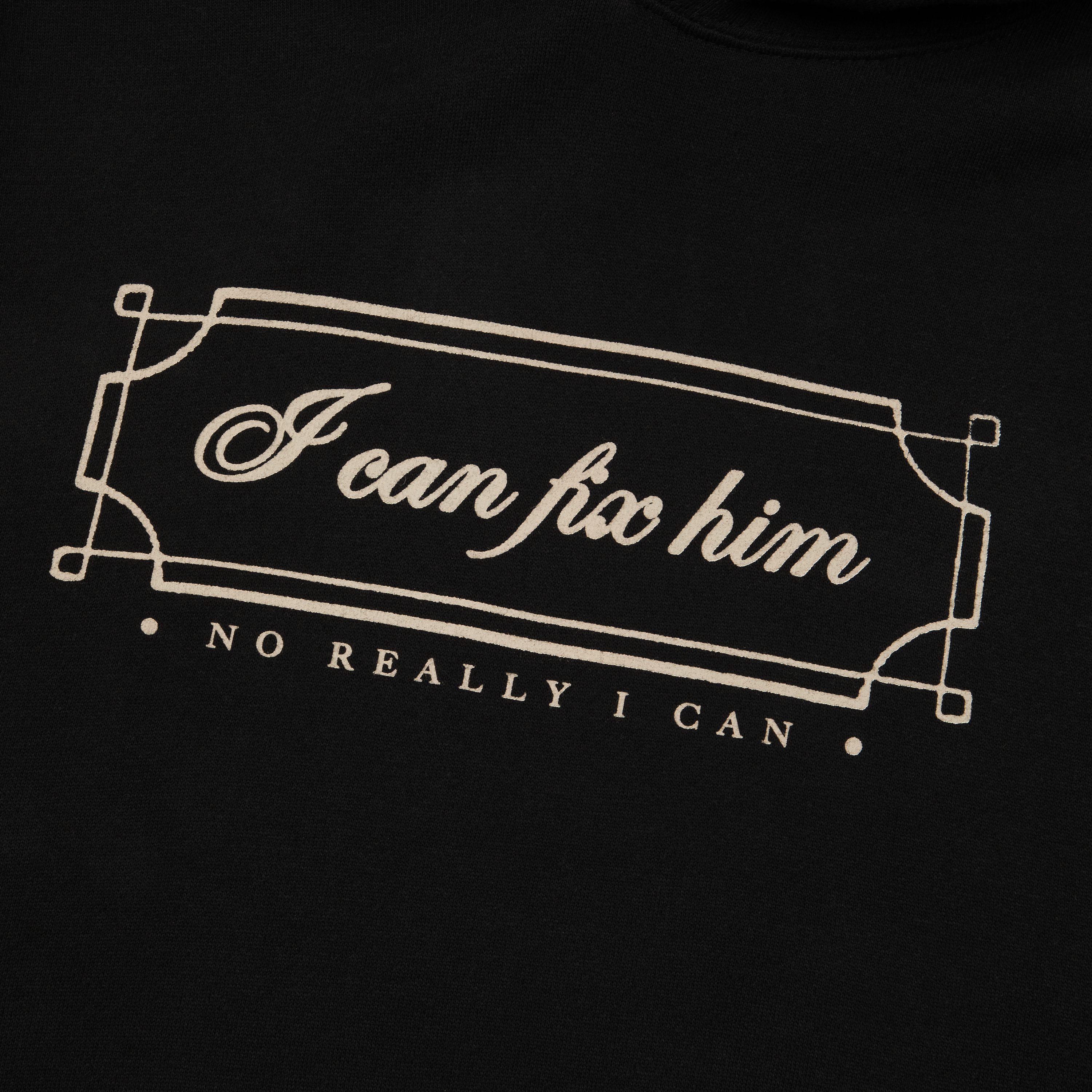 Black hoodie with front pocket featuring double line box design with I Can Fix Him No I Really Can song lyrics printed on front and TTPD album logo on wearer’s right sleeve.