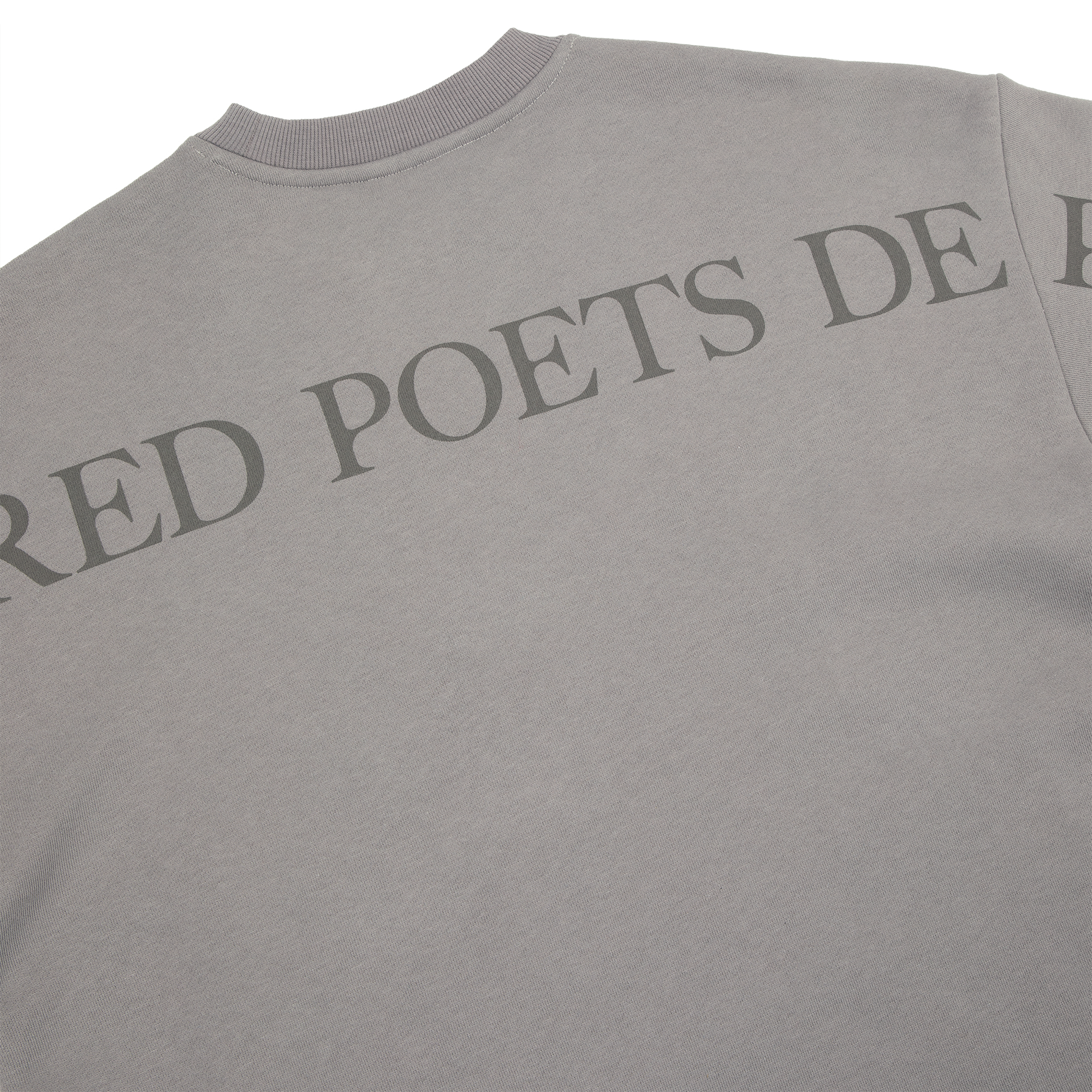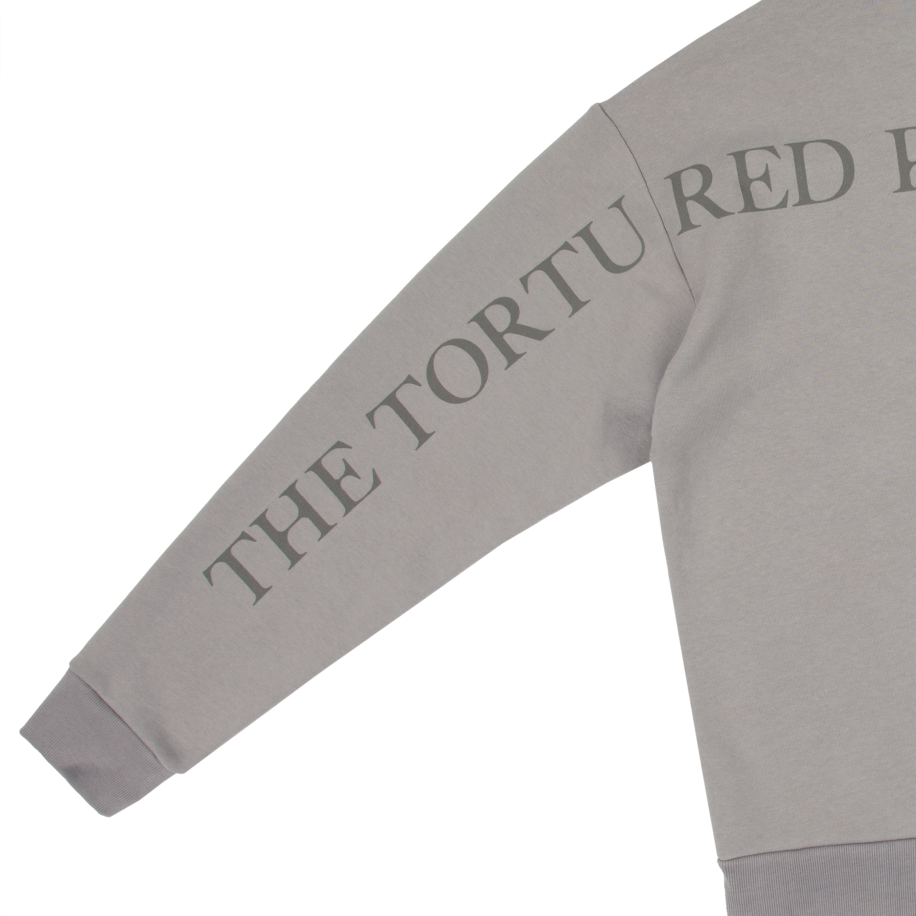 Gray crewneck featuring I Love You It’s Ruining My Life song lyrics printed on front with The Tortured Poets Department printed on back and down both sleeves.
