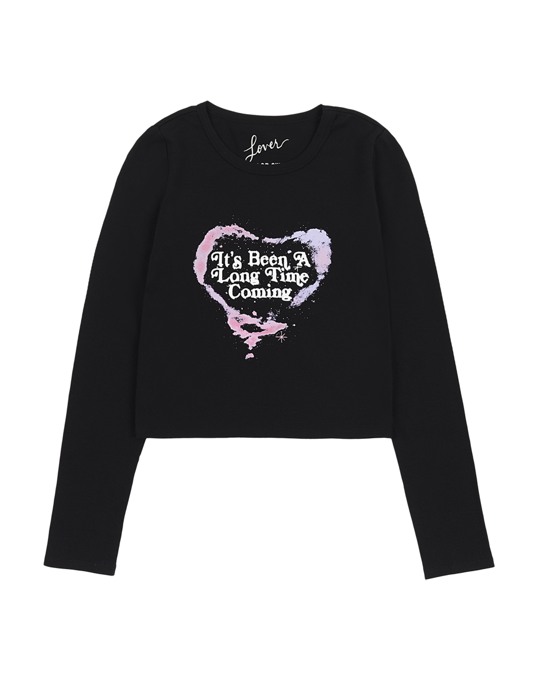 Black fitted longsleeve t-shirt featuring It’s been a long time coming song lyrics with heart design printed on front.