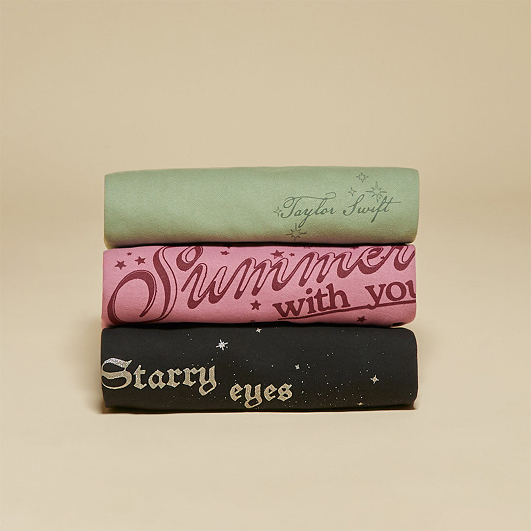 Black crewneck featuring Starry eyes sparking up my darkest night song lyrics with star glitter design printed on front with moon phase designs and Call It What You Want song lyrics glitter printed down wearer’s right sleeve with moon and star glitter design printed down wearer’s left sleeve and Taylor Swift in glitter printed vertically with star design on back.