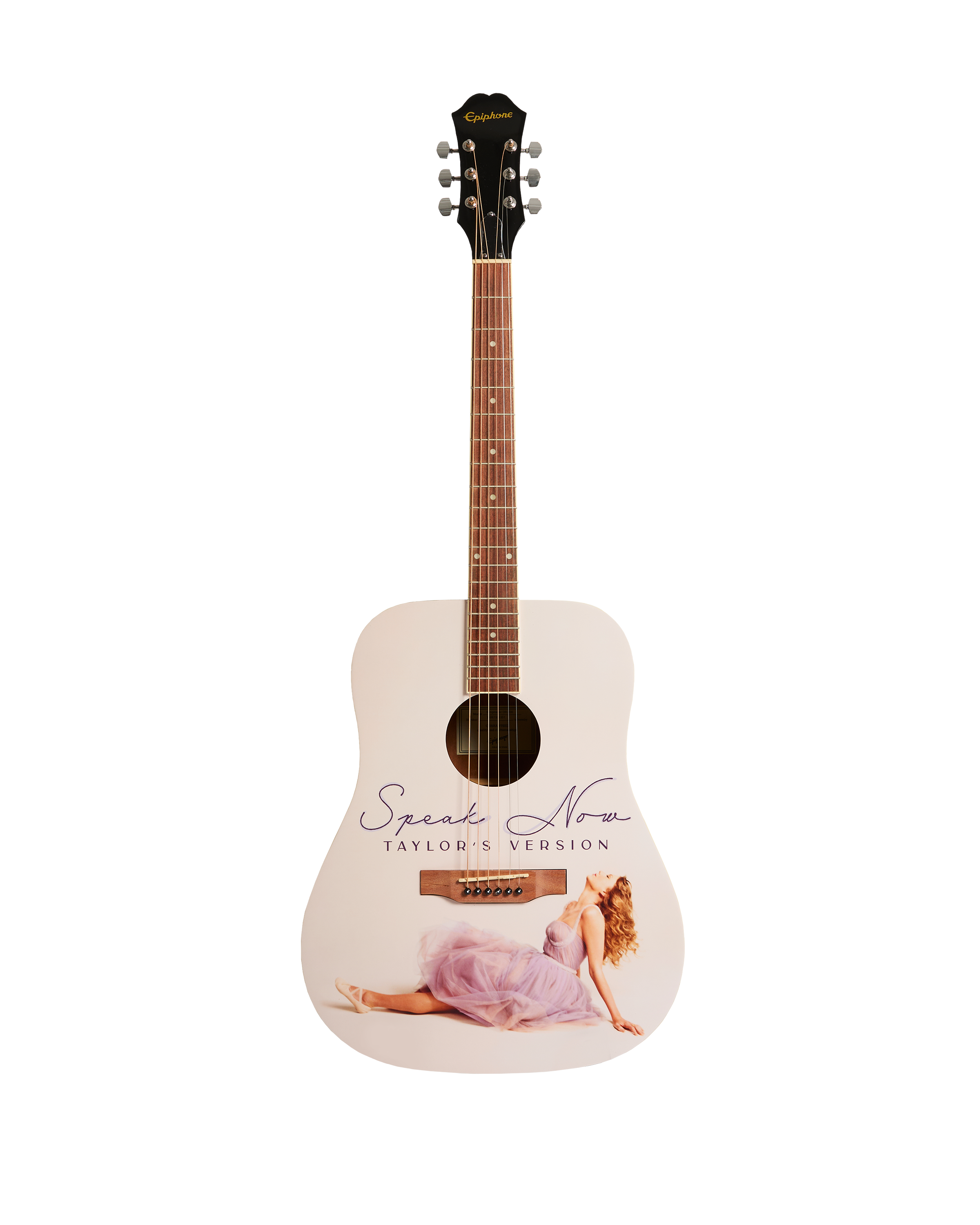Acoustic Epiphone DR-100 guitar with custom-designed Speak Now (Taylor’s Version) album photo of Taylor Swift and Speak Now Taylor’s Version printed on front. Each guitar comes with a unique serial number printed on the back of the guitar headstock to identify this collectible product.