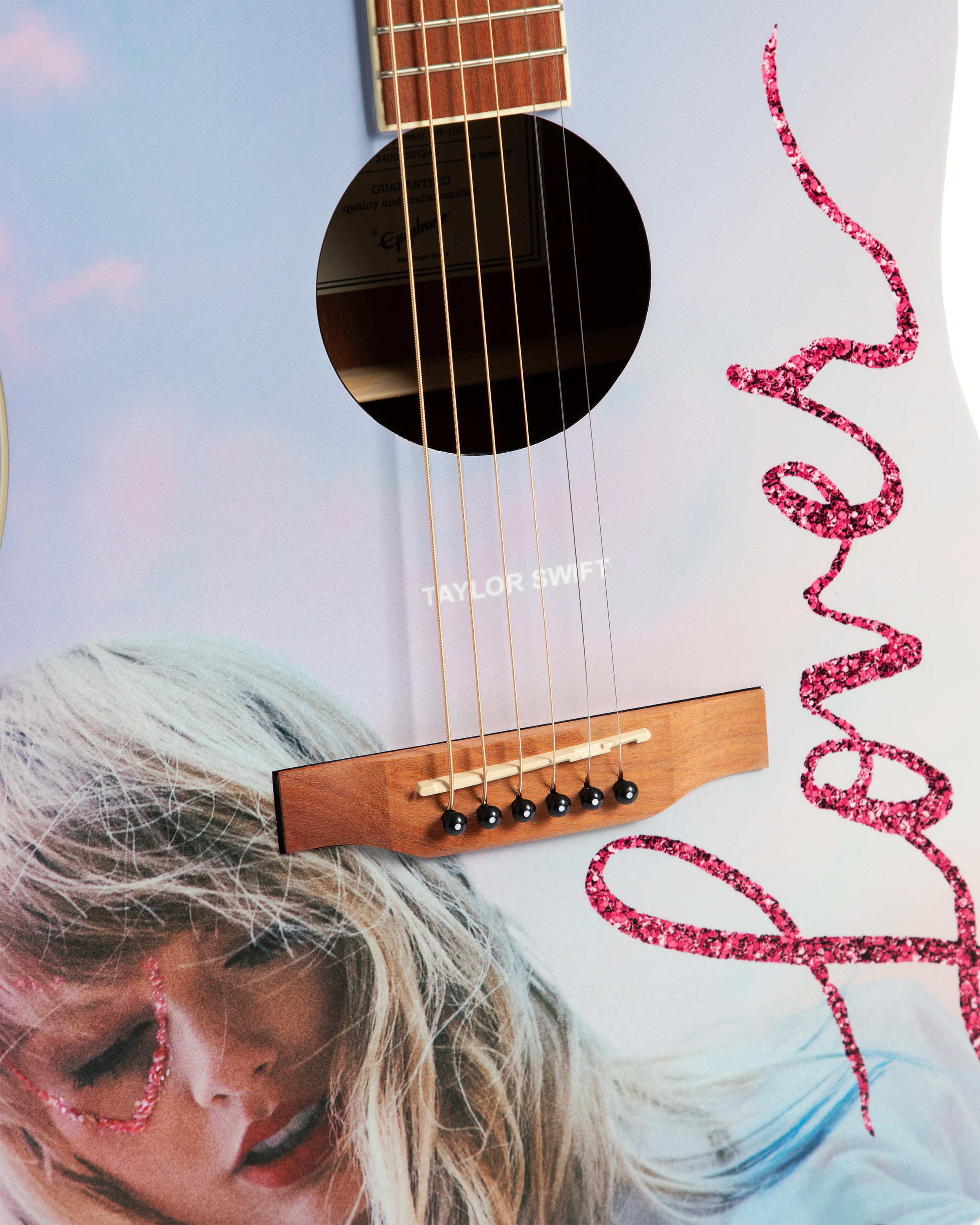 Acoustic Epiphone DR-100 guitar with custom-designed Taylor Swift Lover album photo of Taylor Swift and Taylor Swift Lover printed on front. Each guitar comes with a unique serial number printed on the back of the guitar headstock to identify this collectible product.