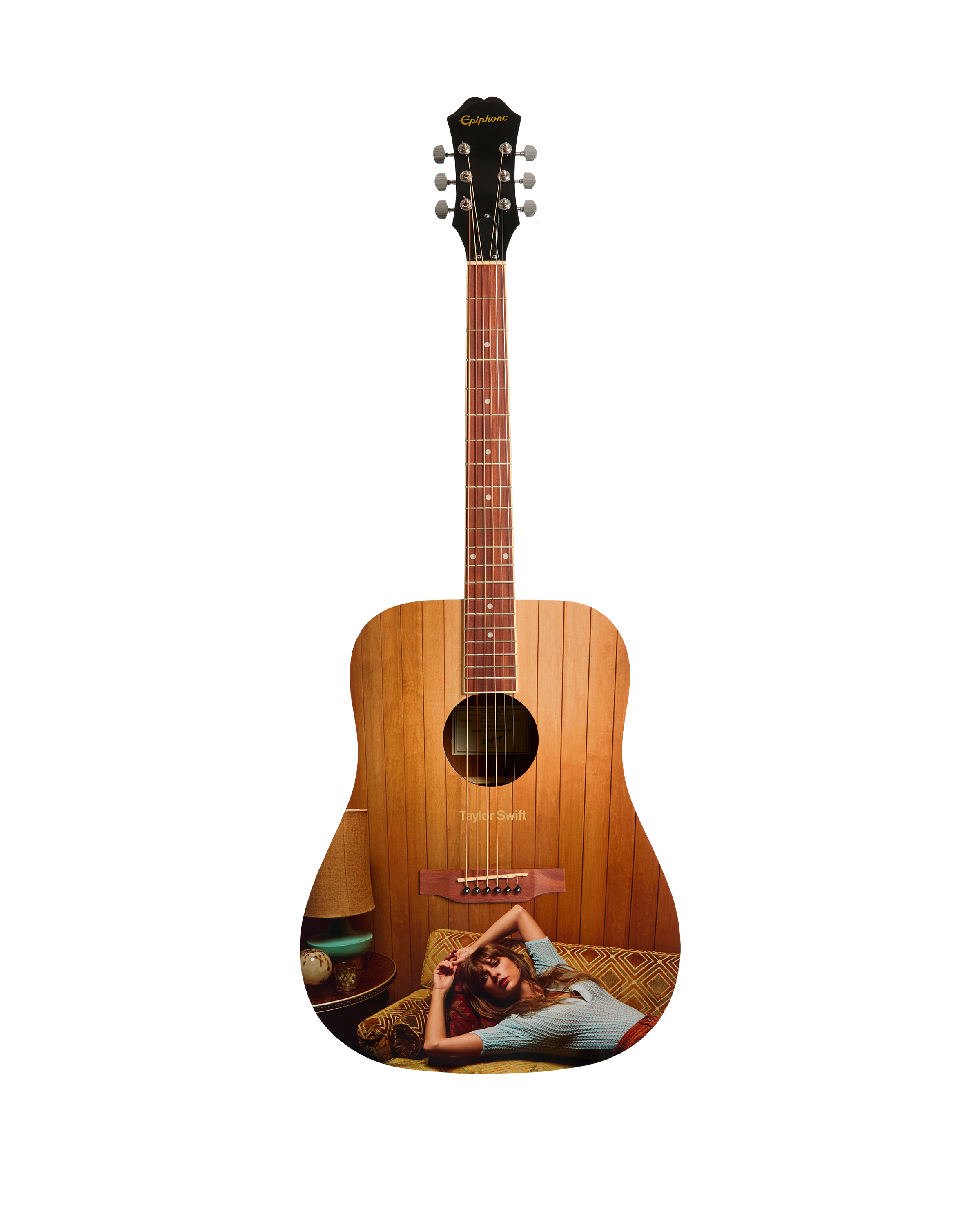 Acoustic Epiphone DR-100 guitar with Taylor Swift Midnights photo printed on front and Taylor Swift printed in center. Each guitar comes with a unique serial number printed on the back of the guitar headstock to identify this collectible product.