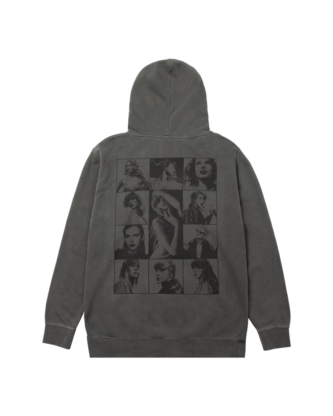 Charcoal hoodie with front pocket featuring Taylor Swift The Eras Tour printed on front and photos of Taylor Swift printed on back.