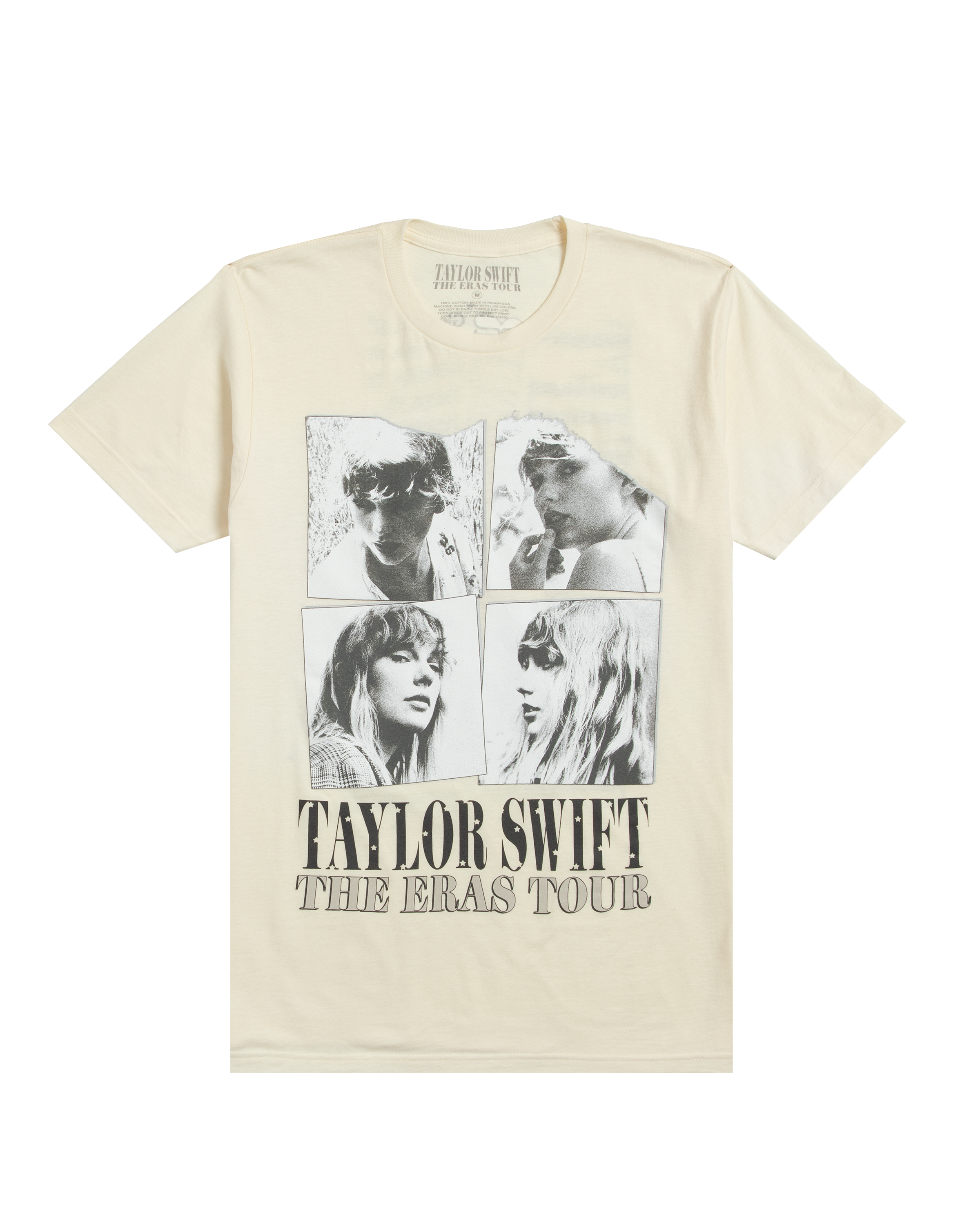 Cream t-shirt with folklore album era photos of Taylor Swift and Taylor Swift | The Eras Tour printed on front with Taylor Swift | The Eras Tour and tour locations printed on back.