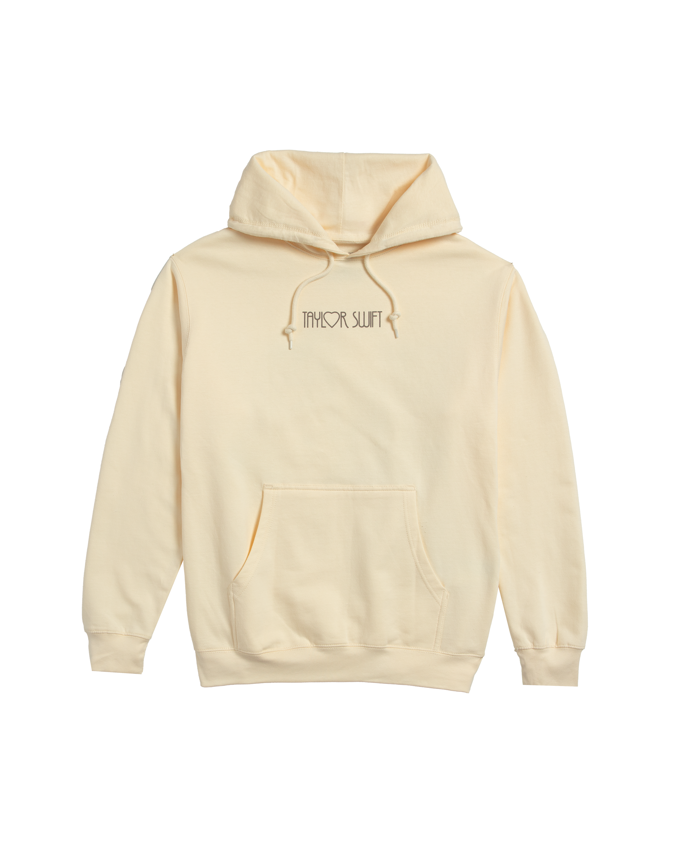 Beige hoodie with front pocket featuring Taylor Swift printed on front with heart design and photo of Taylor Swift with Taylor Swift | The Eras Tour printed on back with heart and star designs.