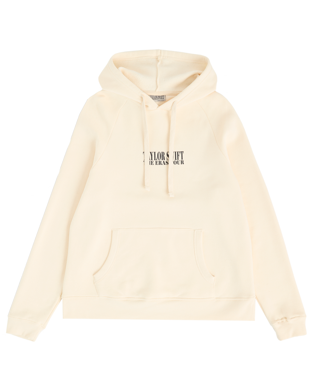 Beige hoodie with front pocket featuring Taylor Swift The Eras Tour printed on front with photos of Taylor Swift printed on back.