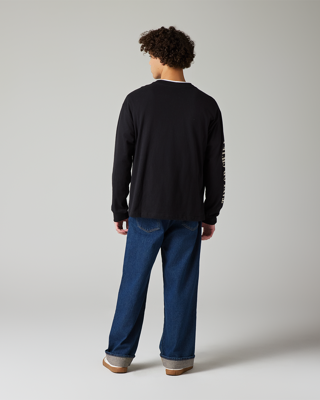 Black long sleeve t-shirt featuring Taylor Swift The Eras Tour printed on wearer’s right sleeve and photo of Taylor Swift printed on front.