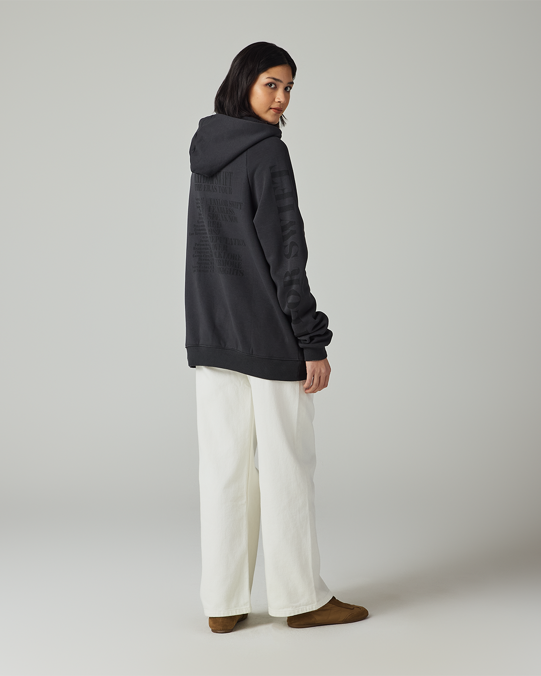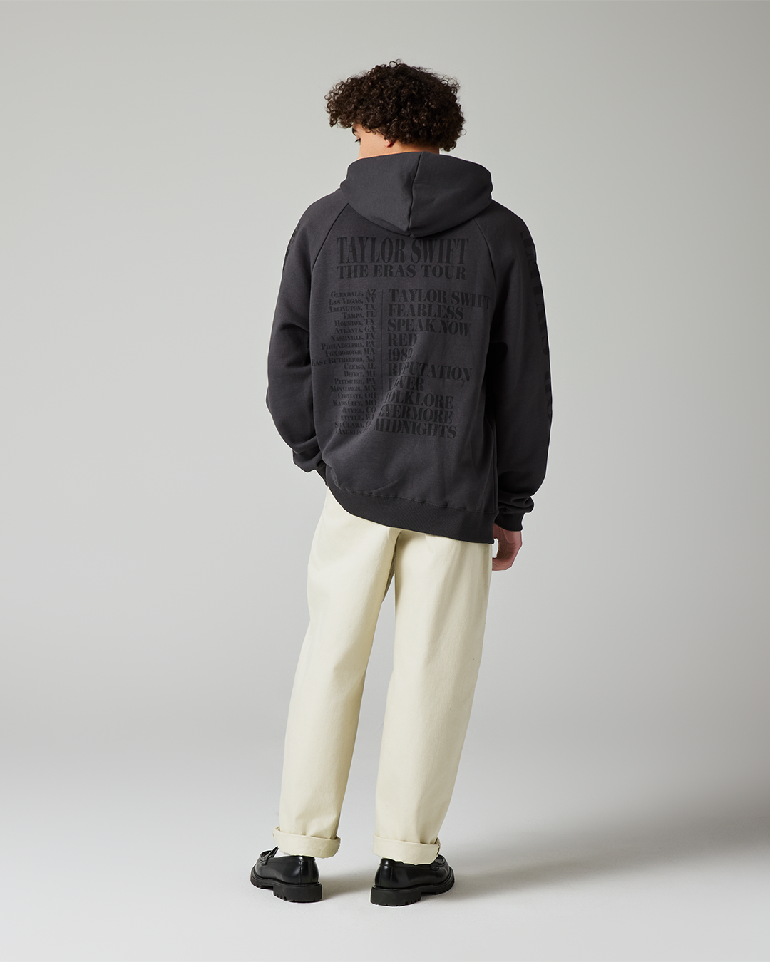 Black hoodie with front pocket featuring photos of Taylor Swift printed on front with Taylor Swift printed on wearer’s right sleeve and The Eras Tour printed on wearer’s left sleeve and Taylor Swift | The Eras Tour. United States tour locations. and Taylor Swift album titles printed on back.