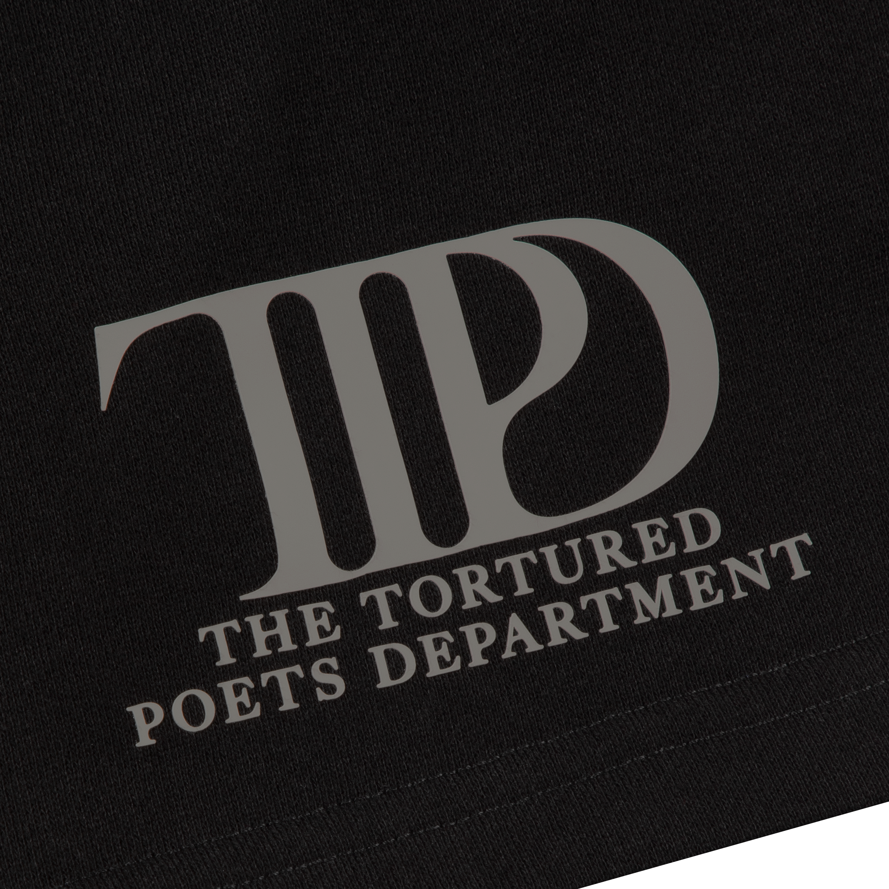 Ink black sweat shorts featuring gray TTPD album logo and The Tortured Poets Department printed on wearer’s left leg. Drawstring waist and side pockets.