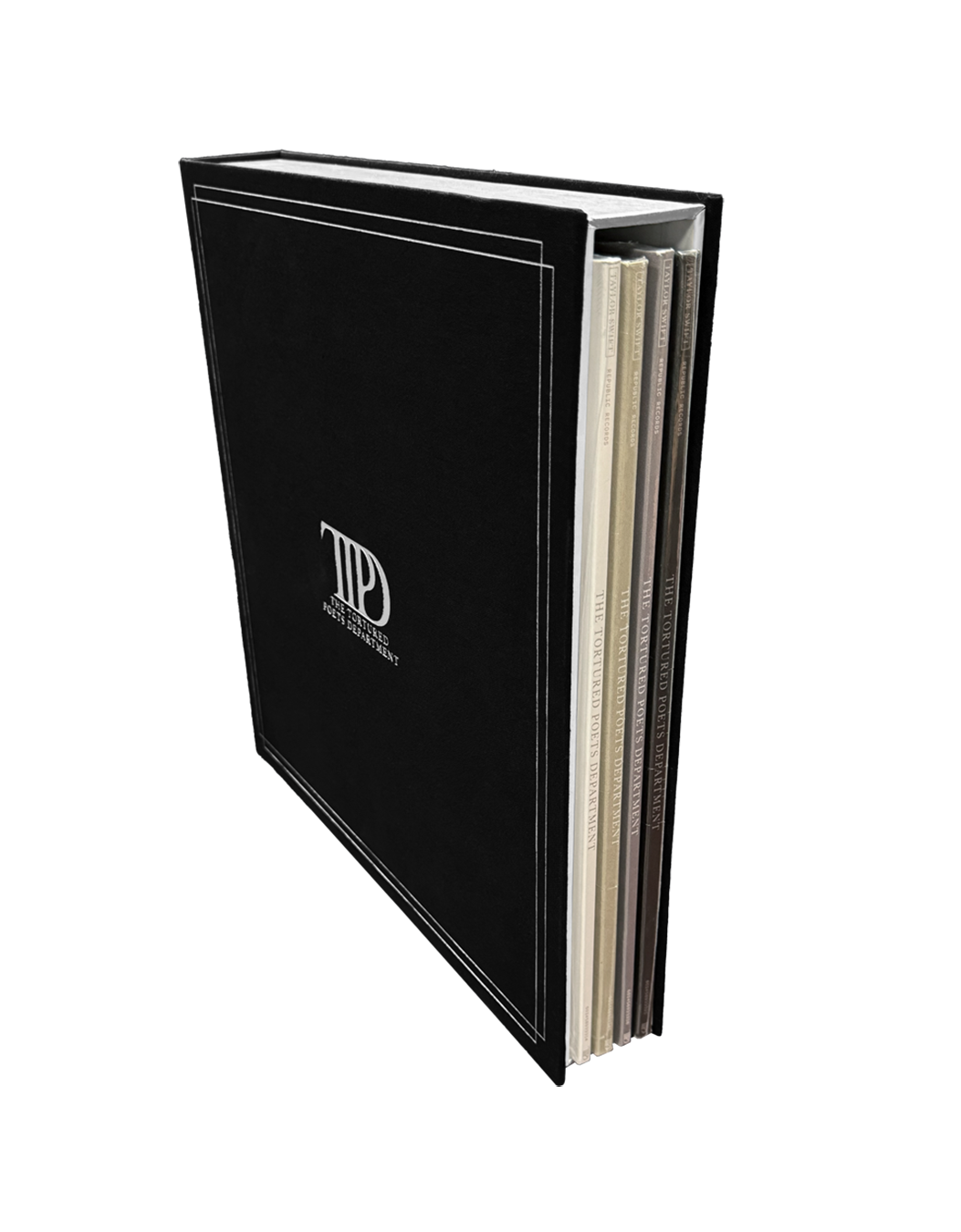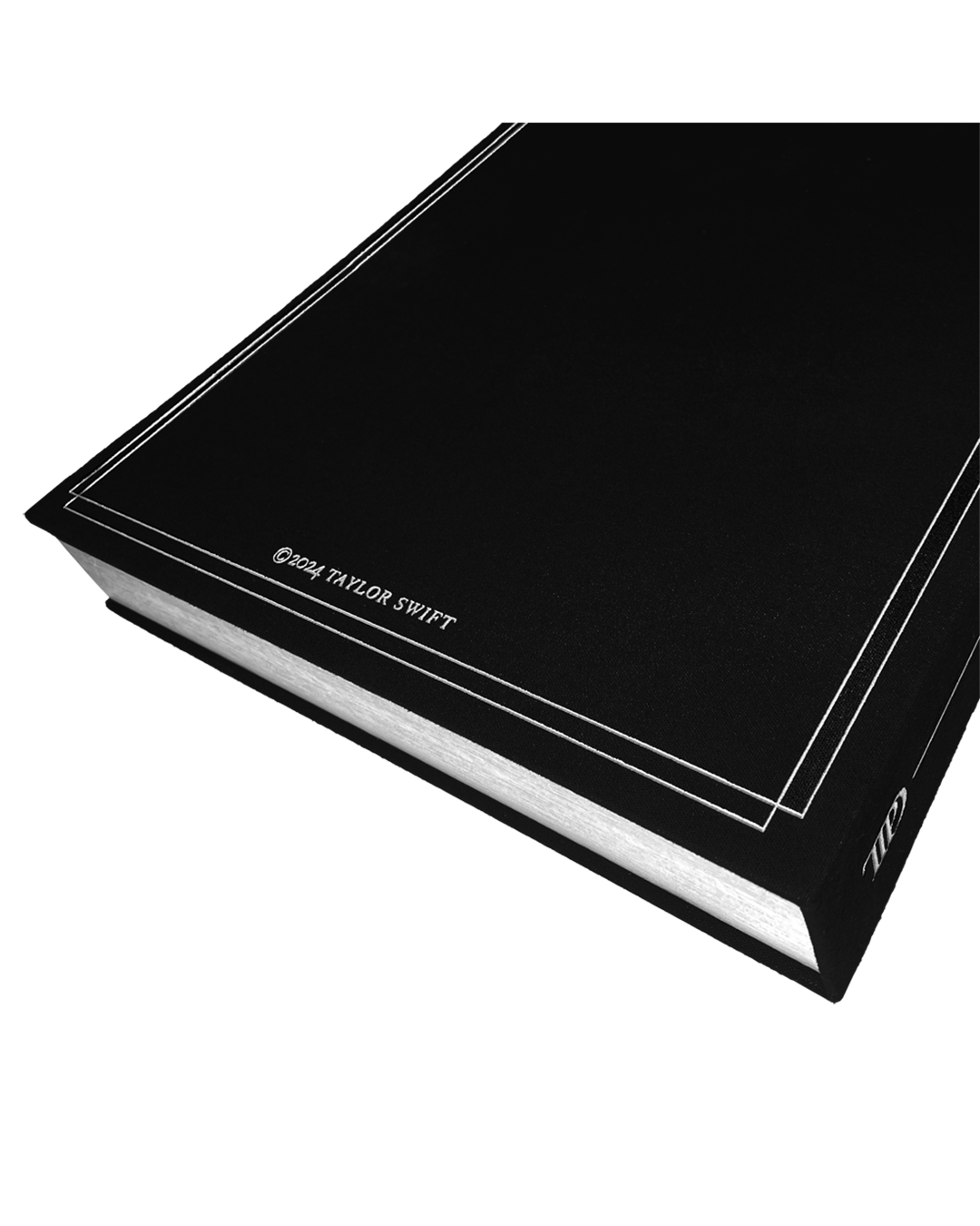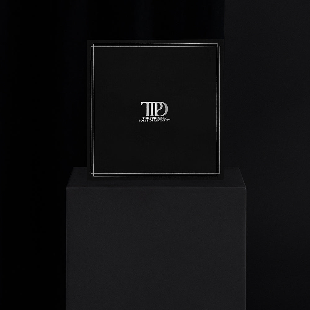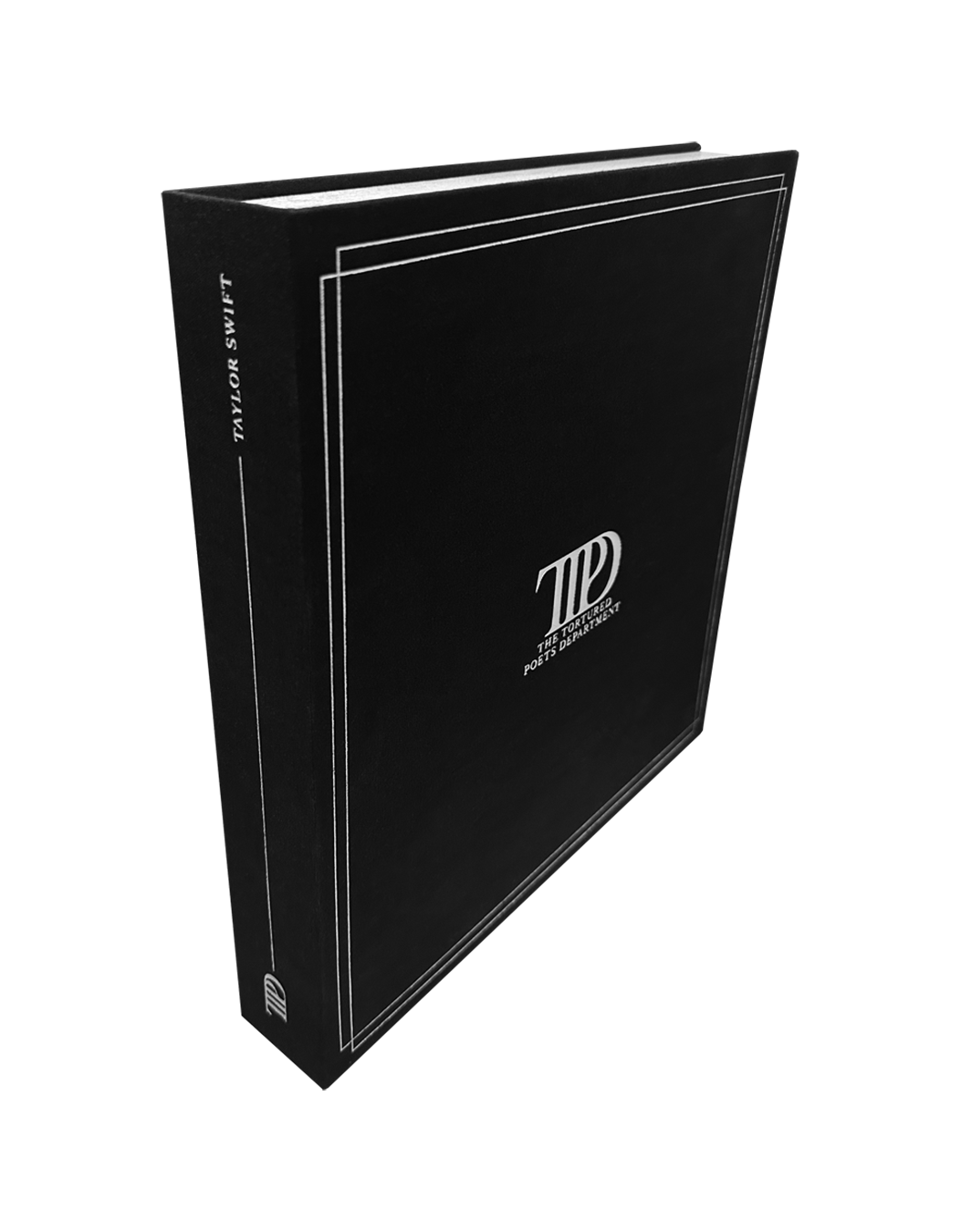 Black vinyl display case featuring metallic silver double line border design. TTPD album logo. and The Tortured Poets Department embossed on front with TTPD album logo. line design. and Taylor Swift embossed on side and ©2024 Taylor Swift with metallic silver double line border design embossed on back.