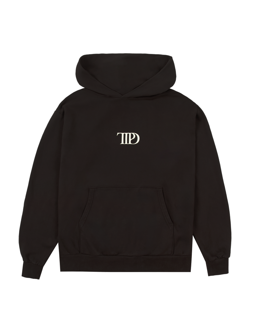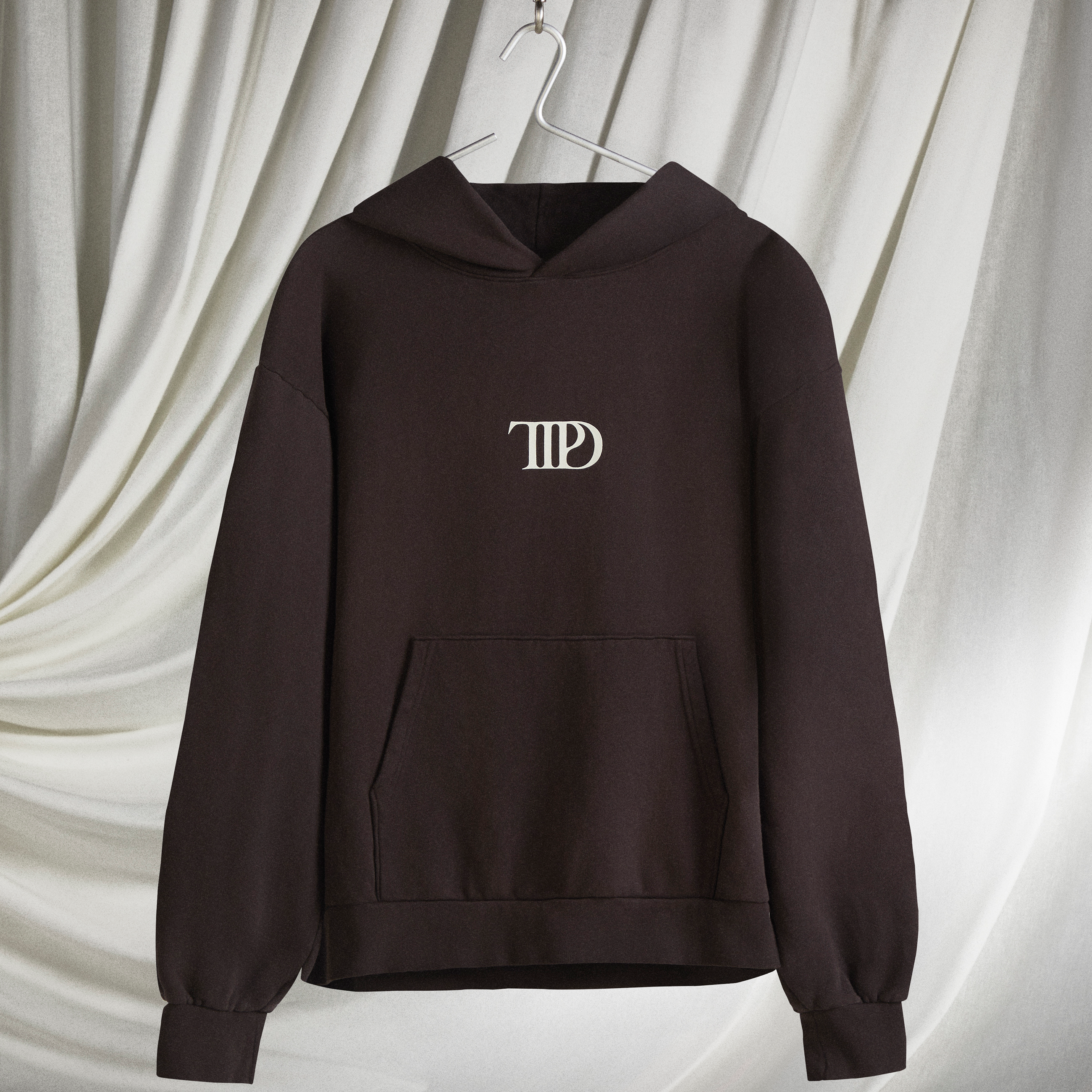 Dark brown hoodie with front pocket featuring TTPD album logo printed on front and photo of Taylor Swift. Who’s Afraid Of Little Old Me? song lyrics. You Should Be song lyrics and The Tortured Poets Department in box design printed on back.